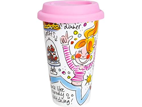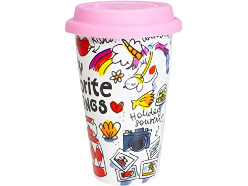 My Favorite things! Kun jij ook niet op pad zonder koffie of thee? Neem je koffie of thee mee in deze vrolijke coffee to go beker. De beker is dubbelwandig en gemaakt van porselein. Op de beker staan illustraties van allerlei favoriete bezigheden zoals taartjes eten, vakantie souvenirs kopen en dansen alsof niemand kijkt. De roze deksel is gemaakt van siliconen.