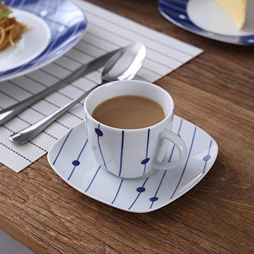 Inhoud van de levering: 6 koffiekopjes (220 ml, H 6,7 cm), 6 schotels (diameter 14,7 cm), 6 dessertborden (diameter 19,2 cm), 6 soepborden (180 ml, Ø 21,5 cm), 6 platte borden (diameter 24,7 cm)