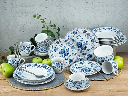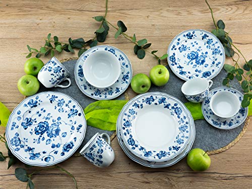 Je ontvangt hier een echt mooi 16-delig combinatieservies “Made in Europe” van porselein in de volgende samenstelling: – 4 platte borden van 26 cm, – 4 dessertborden van 21 cm, – 4 koffiekopjes 30 cl, – 4 multifunctionele schalen van 13 cm. Dit klassieke servies presenteert zich met een inglazuur op een vaste vorm in een romantische landelijke stijl. De fijn afgewerkte rozenmotieven in een weelderig systeem geven de service glans en elegantie. Royal Blue Flower: een klassieker