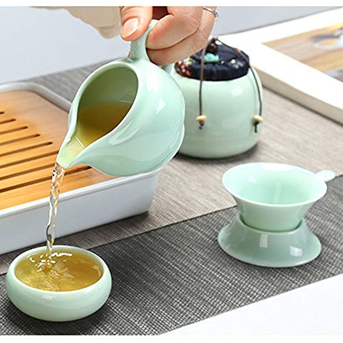 fanquare Draagbare reistheeset, handgemaakte Kungfu theeset, porseleinen theepot, theekopjes, bamboe theedienblad met draagbare reistas, groen
