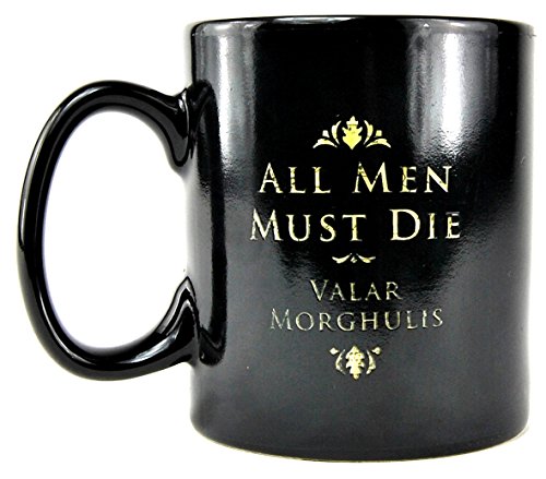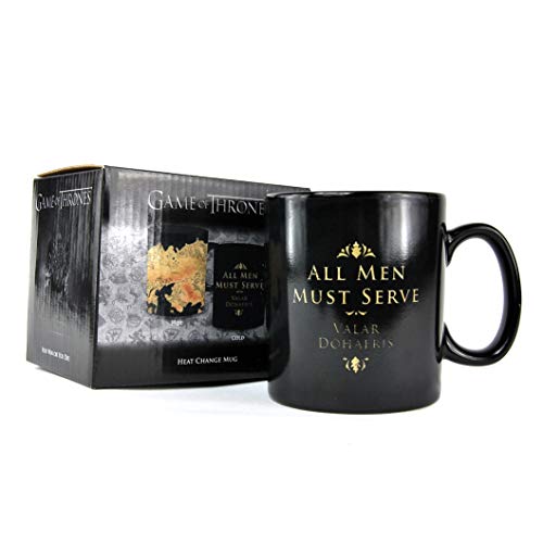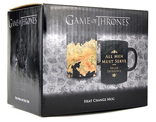 Game of Thrones Westeros kaartenwarmtekussen. Koud, de beker toont de Phrase “alle mannen moeten dienen” (in het Engels) en zijn hoge valyriaanse vertaling “Valar Dohaeris” op de voorkant en “alle mannen moeten sterven” (in het Engels) en zijn vertaling “Valar Morghulis” op de terug. Als er hete vloeistof wordt gegoten, verandert de beker om de kaarten van de continenten Westeros en Essos te tonen. Zodra de drank klaar is, keert de beker terug naar zijn oorspronkelijke staat als hij afkoelt.